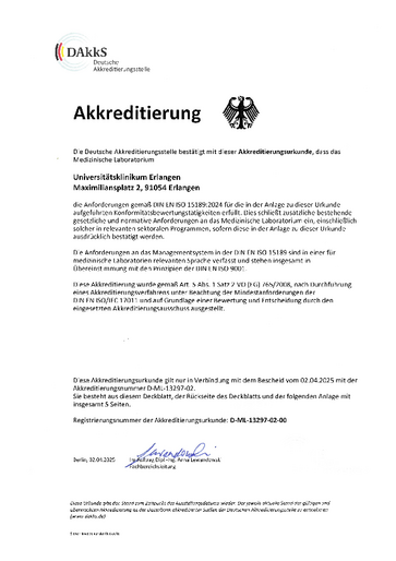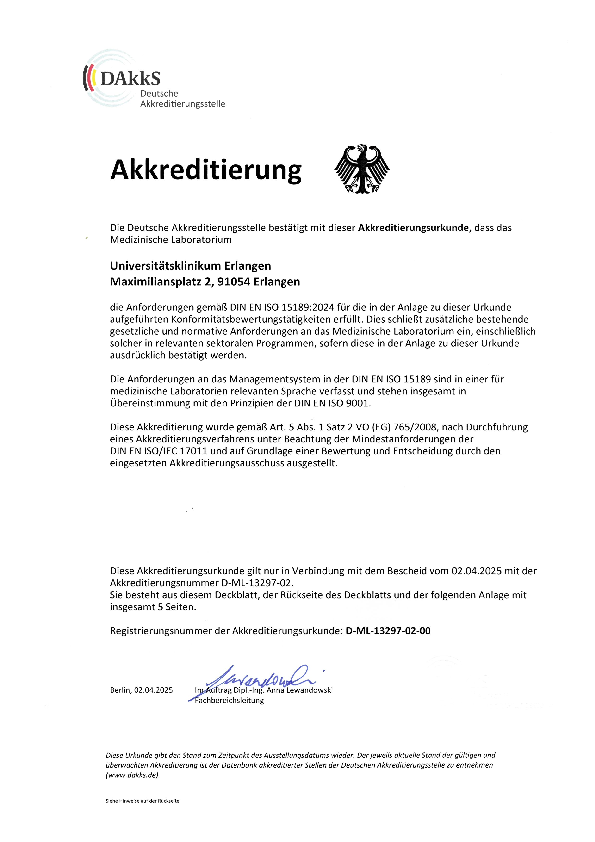 Dieses qualitativ hochwertige Niveau spiegelt sich in der Akkreditierung nach DIN EN ISO 15189:2024 wieder. Das Labor für Klinische Neurochemie und Neurochemische Demenzdiagnostik besitzt nach DIN EN 15189:2024 die Kompetenz Untersuchungen in folgenden Bereichen durchzuführen: