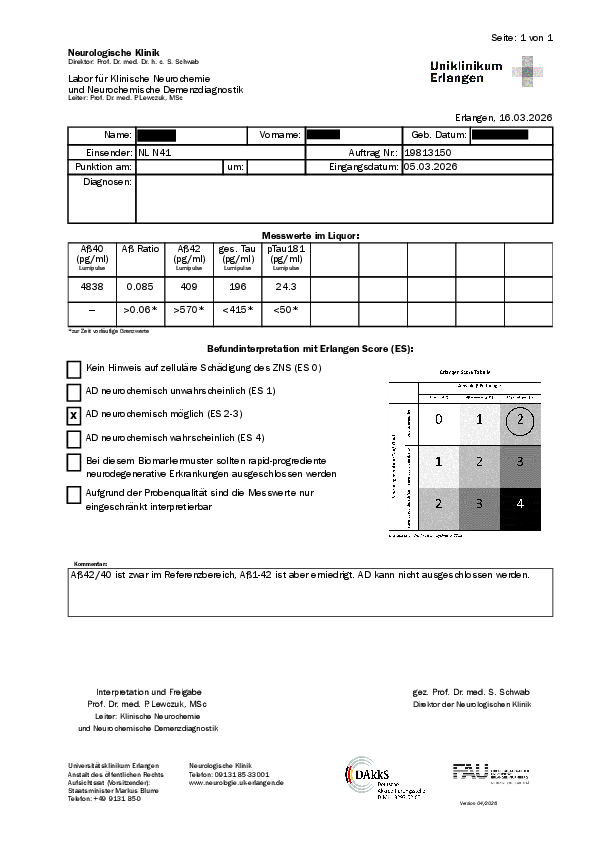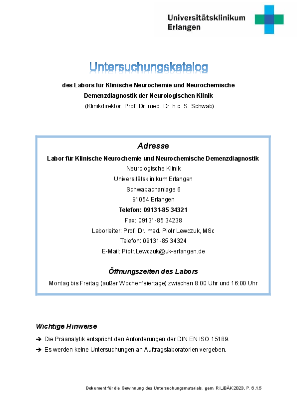 Seite: 1 von 1 ! Direktor: Prof. Dr. med. Dr. h. c. S. Schwab Labor für Klinische Neurochemie und Neurochemische Demenzdiagnostik Leiter: Prof. Dr. med. P. Lewczuk, MSc …