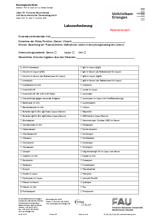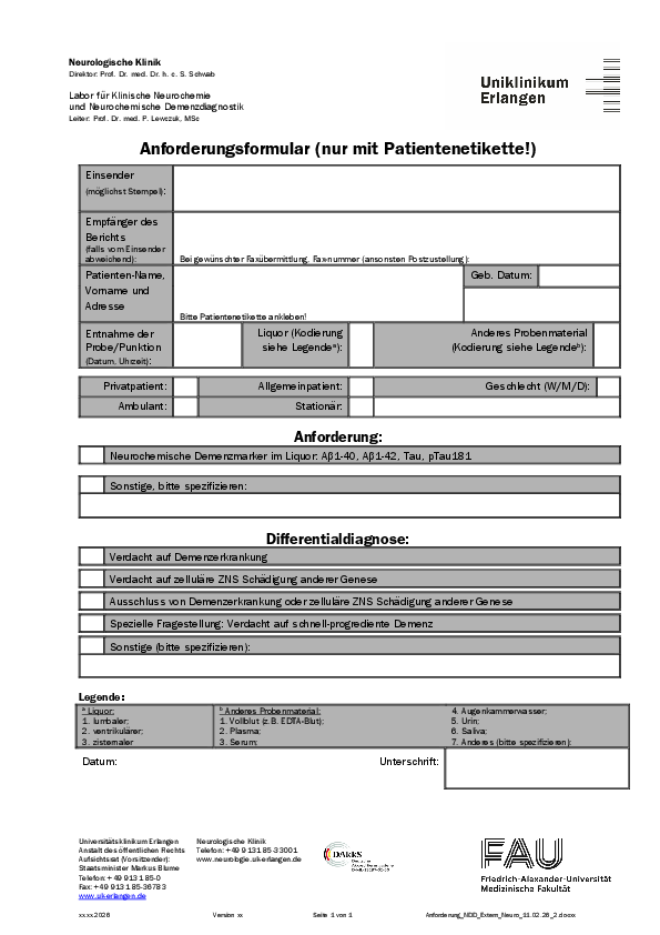 Neurologische Klinik Direktor: Prof. Dr. med. Dr. h. c. S. Schwab Labor für Klinische Neurochemie und Neurochemische Demenzdiagnostik Leiter: Prof. Dr. med. P. Lewczuk, MSc Anforderungsformular…
